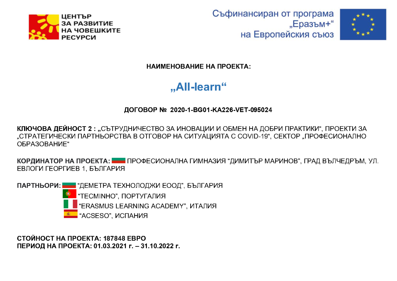 ОСНОВНАТА ЦЕЛ на проекта ALL-LEARN: Да обедини опита на участващите организации за проектиране, разработване, тестване, валидиране, използване, разпространение и поддържане на уеб базирана платформа, адаптирана към мобилни устройства с отворен код, чрез която да се споделя образователно цифрово съдържание, ориентирано към провеждане на практическо обучение в професионално ориентираните специалности.
