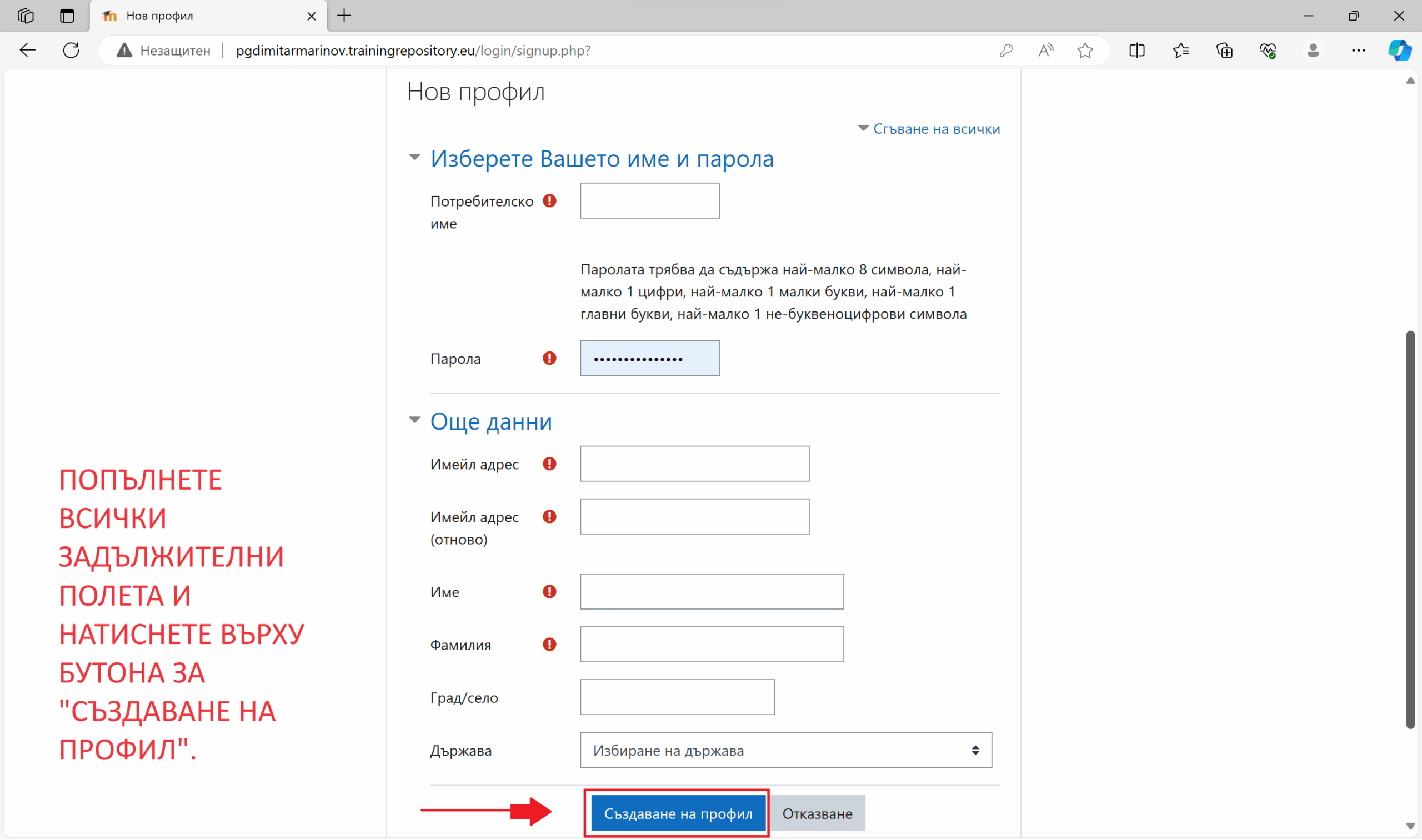 Попълнете всички задължителни полета и натиснете върху бутона „СЪЗДАВАНЕ НА ПРОФИЛ“