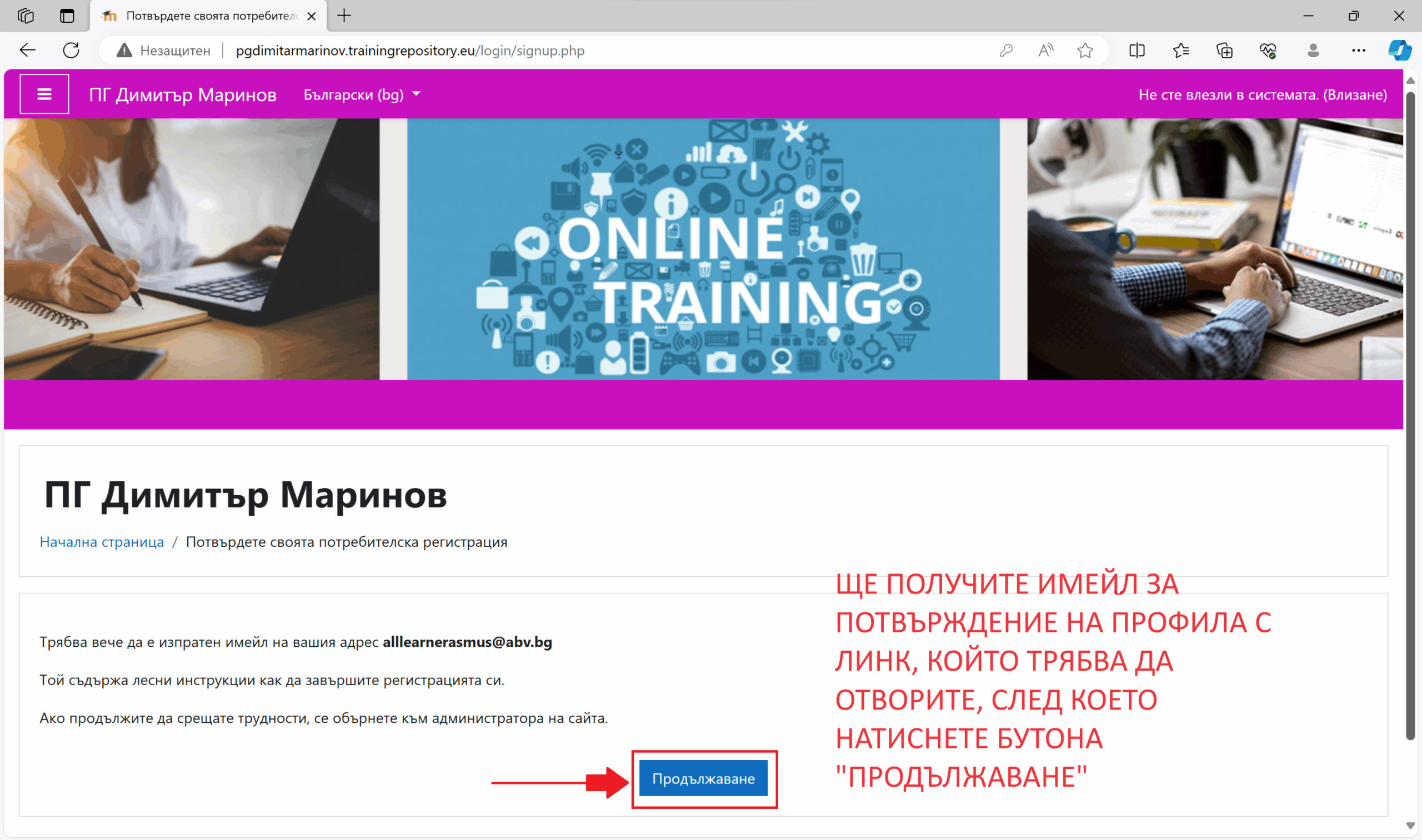 Ще получите имейл за потвърждение на профила с линк, който трябва да отворите, след което натиснете бутона „ПРОДЪЛЖАВАНЕ“