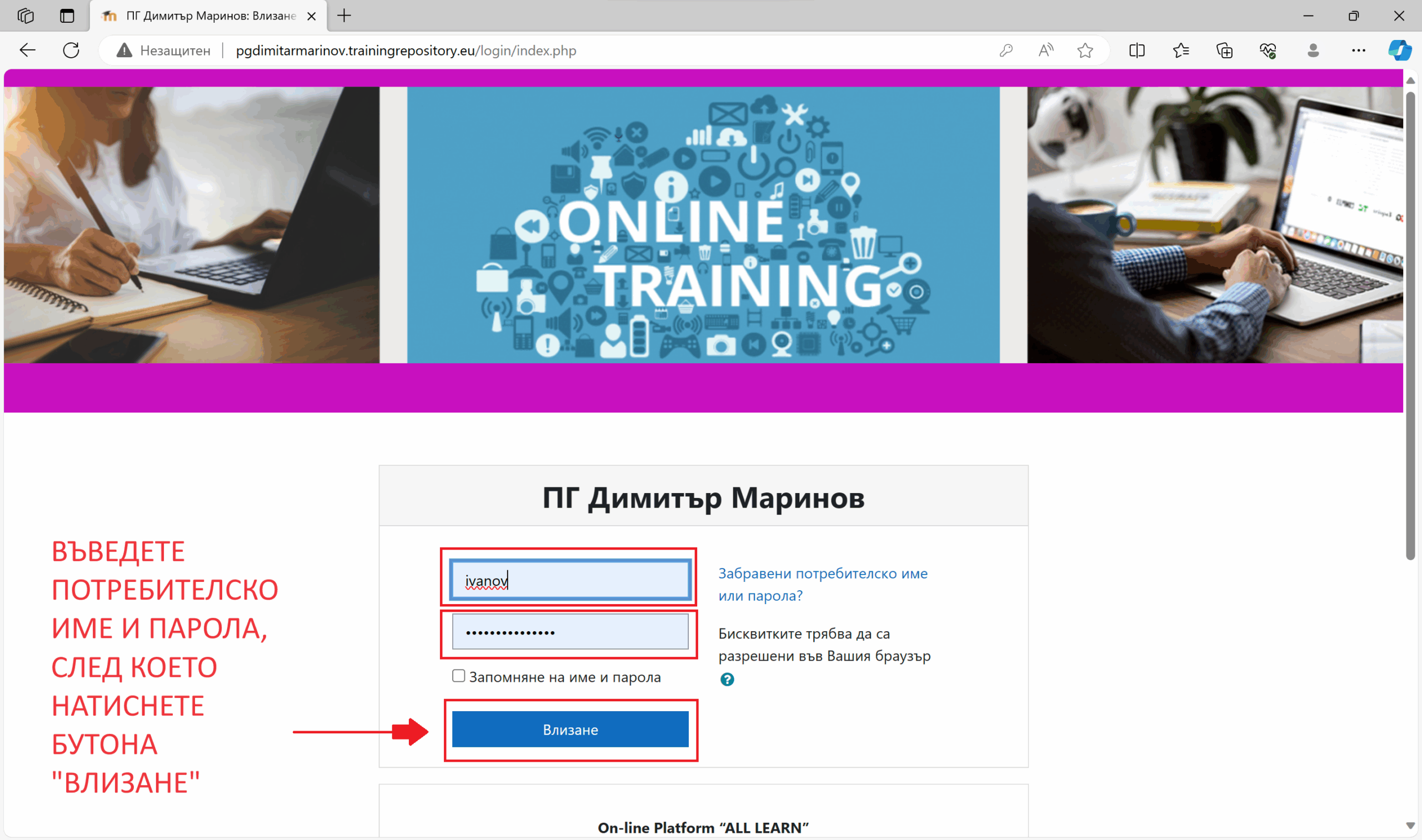 Въведете потребителското име и парола, след което натиснете бутона „ВЛИЗАНЕ“