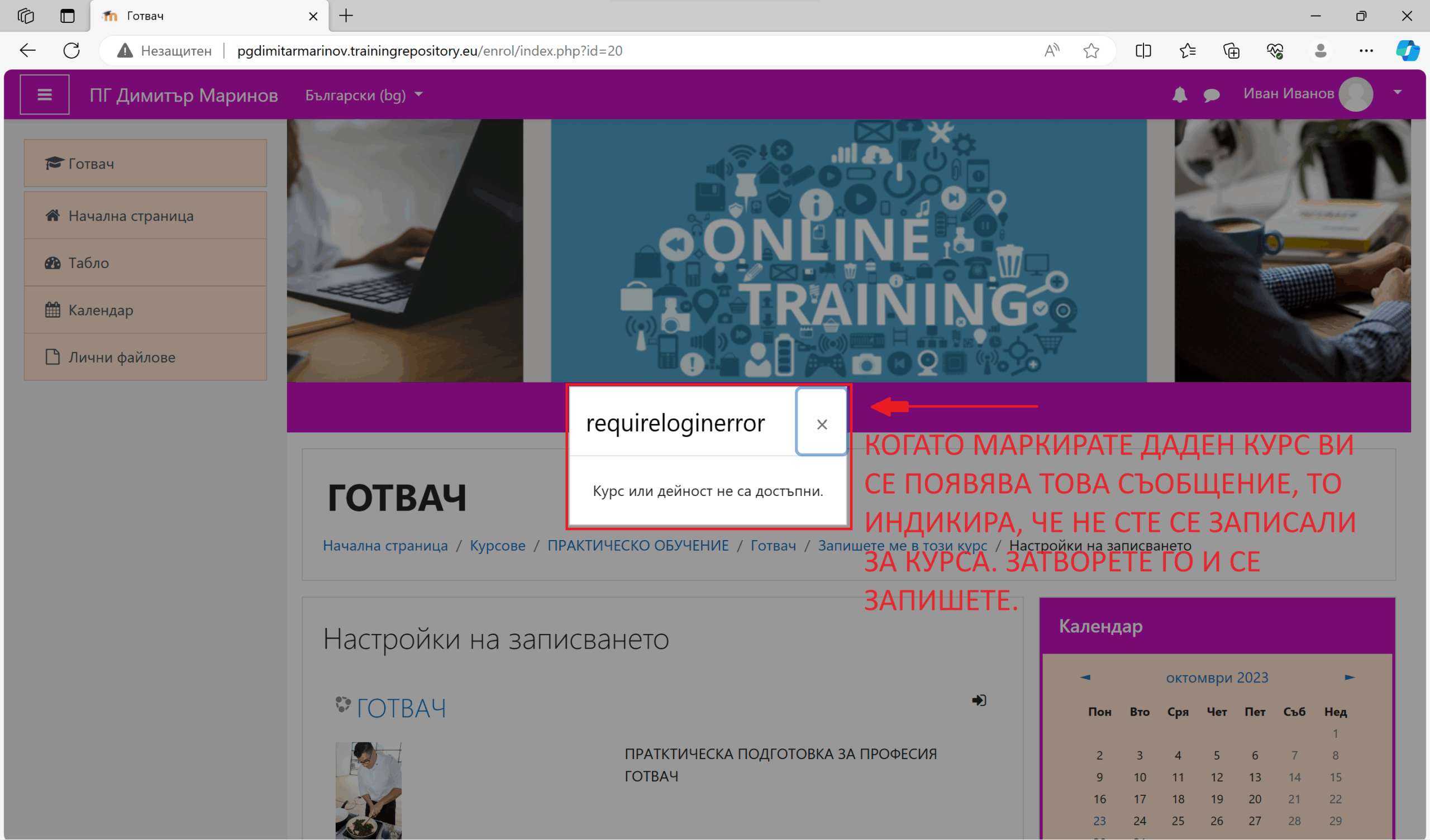 Когато маркирате даден курс Ви се появява това съобщение, то индикира, че не сте се записали за курса, затворете го и се зашишете.